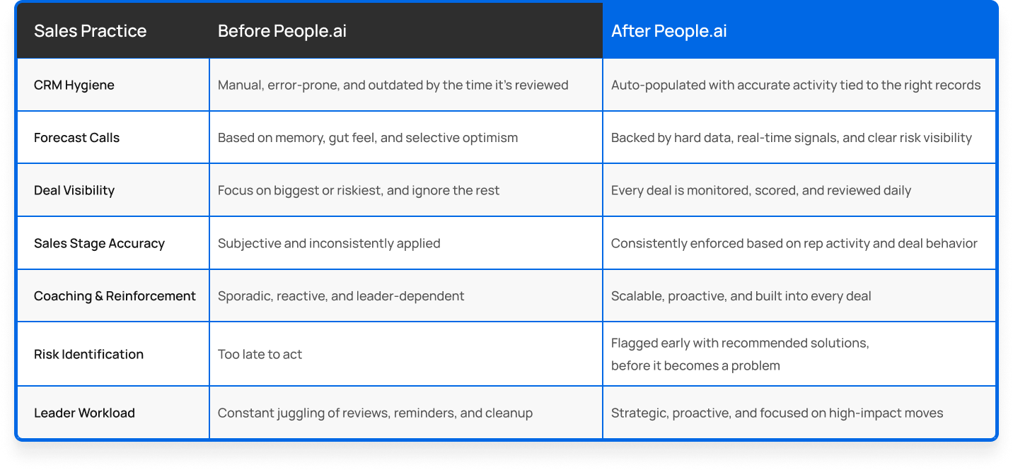 People.ai scales your impact—without burning you out. You can't review 50 deals in a week. But People.ai can. It’s like having a deal desk, process enforcer, and coach embedded into every opportunity…so your team keeps improving, even when you’re not in the room.